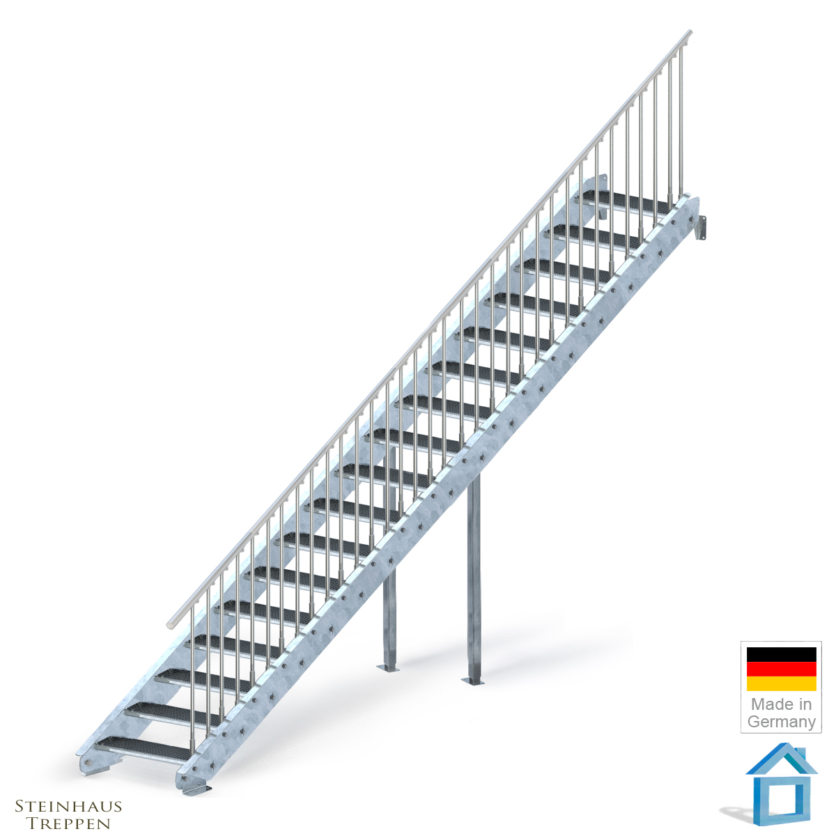 Treppe mit sicherem Geländer. Das Stahlgeländer führt bis zur Oberkante der Treppen-Seitenwangen.