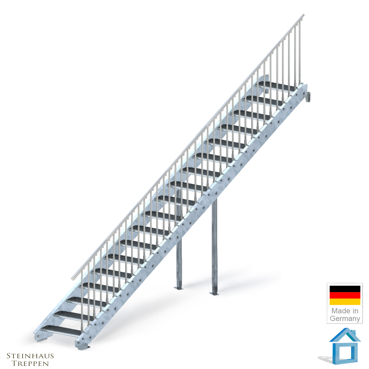 Stahltreppe inklusive Geländer mit senkrechten Rundrohren. Die Länge des Handlaufs kann mit vorhandenen Brüstungsgeländern angebaut und verländert werden.