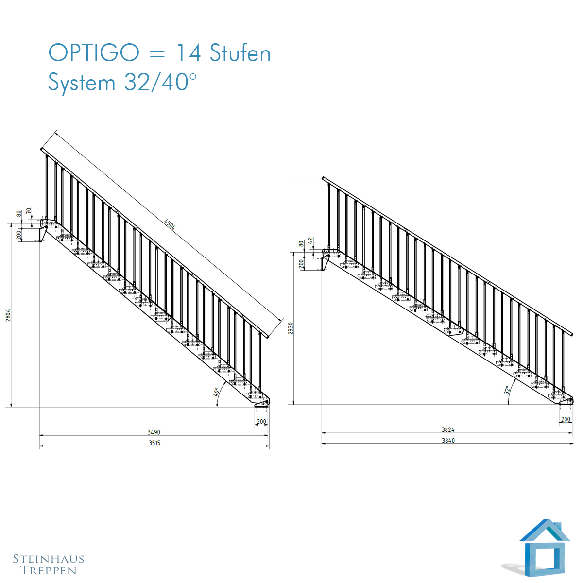 Aufgang vom Garten zur Dachterrasse? mit 14 Stufen in 150 cm geräumiger Treppenbreite. Podeste sind zur geraden Treppe in Längen ab: 81 cm, 108 cm, 135 cm und bis 216 cm nach Bausituation kombinierbar. Außentreppe OPTIGO besteht aus feuerverzinktem Stahlelementen (L-Profil), die Stahl-Stufen sind mit DIN Maschengitter belegt = wir garantieren eine hoche Traglast je Stufe (200 kg), in Industriequalität. Die Treppenstufen haben vorne eine gelochte Sicherheits-Antrittskante. Diese gerade Treppe eignet sich als gerader Aufgang ins erste Obergeschoss und kann beim Ausbau Ihrer oberen Etage direkt ans Haus gebaut werden. Die 14-stufige Nebentreppe erreicht Geschosshöhen von 233 cm bis 280 cm.