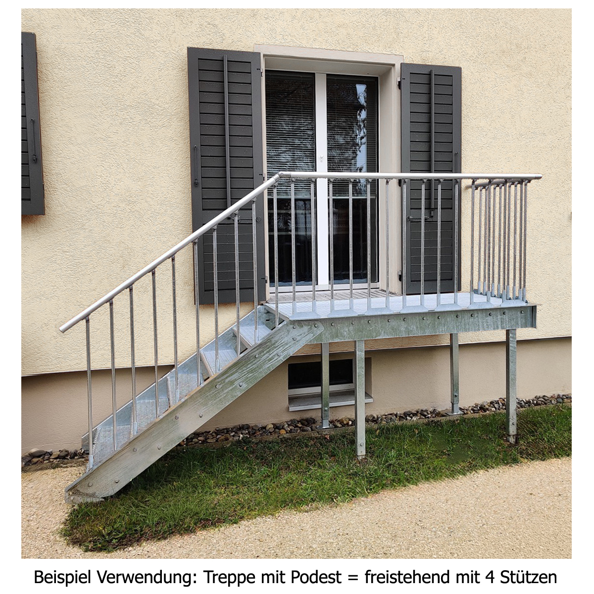 Der Podest-Bausatz besteht aus feuerverzinkten Stahlwangen mit einem U-Profil für den hinteren Wandanbau und 2 x Bodenstützen: Zwei vordere Stahlstützen zur Bodenmontage mit Standplatte zum Verschrauben im Fundament, mit passender Länge nach Auswahl.