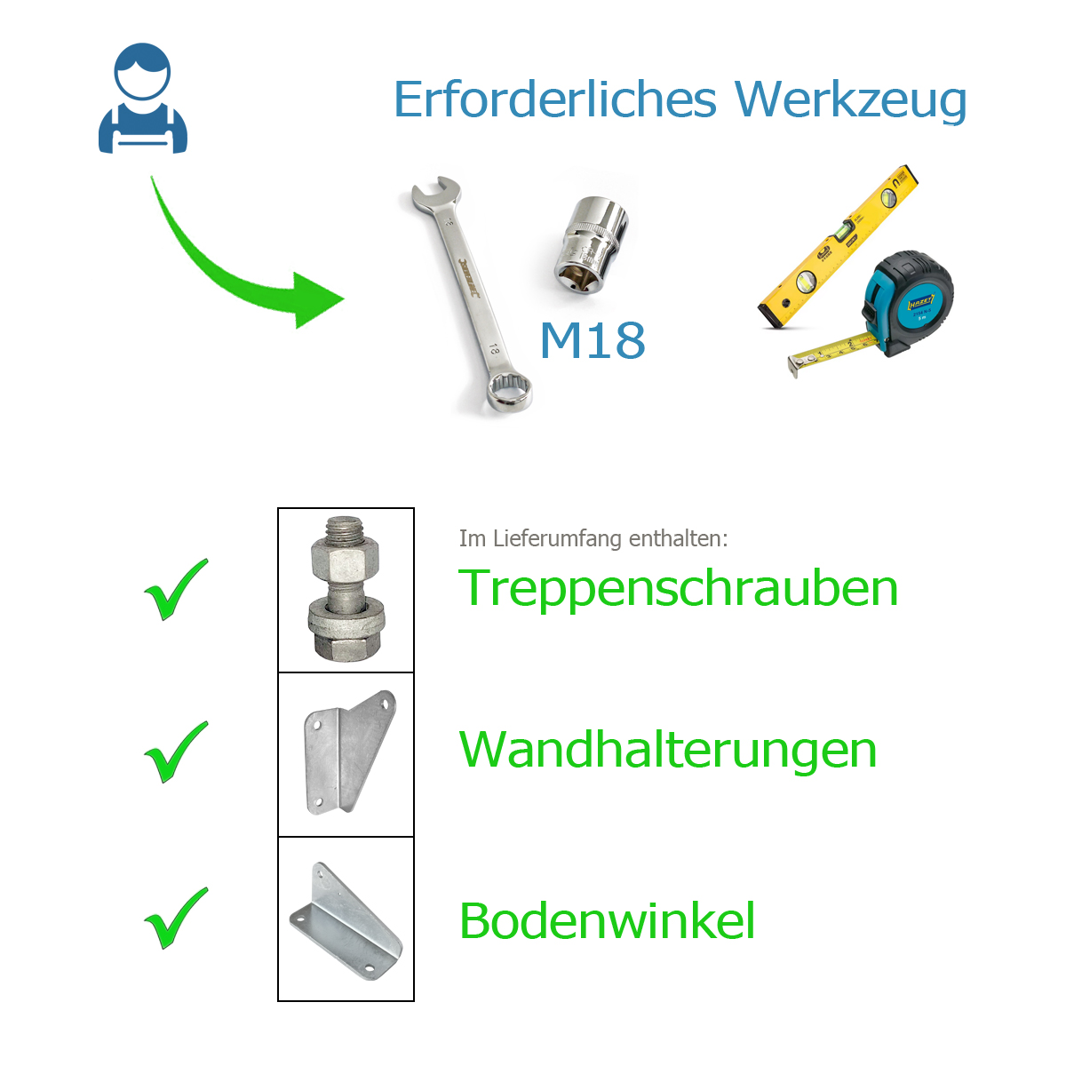 sind keine Beschläge enthalten - Schraubenverbindungen für den Zusammenbau der Stahltreppe sind im Lieferumfang enthalten