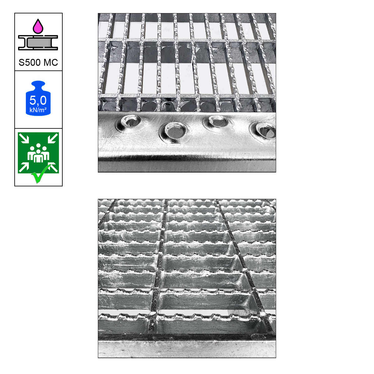 - Stahlrost Belag mit Masche 31/9 mm, Stufenvorderseite mit gelochter Sicherheits- Antrittkante