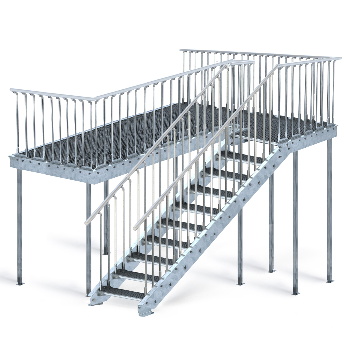 Verwandeln Sie Ihre Terrasse mit unserem Podest Bausatz aus Stahl in einen stilvollen und funktionalen Außenbereich: Balkonpodest in Kombination mit Zugangstreppe OPTIGO