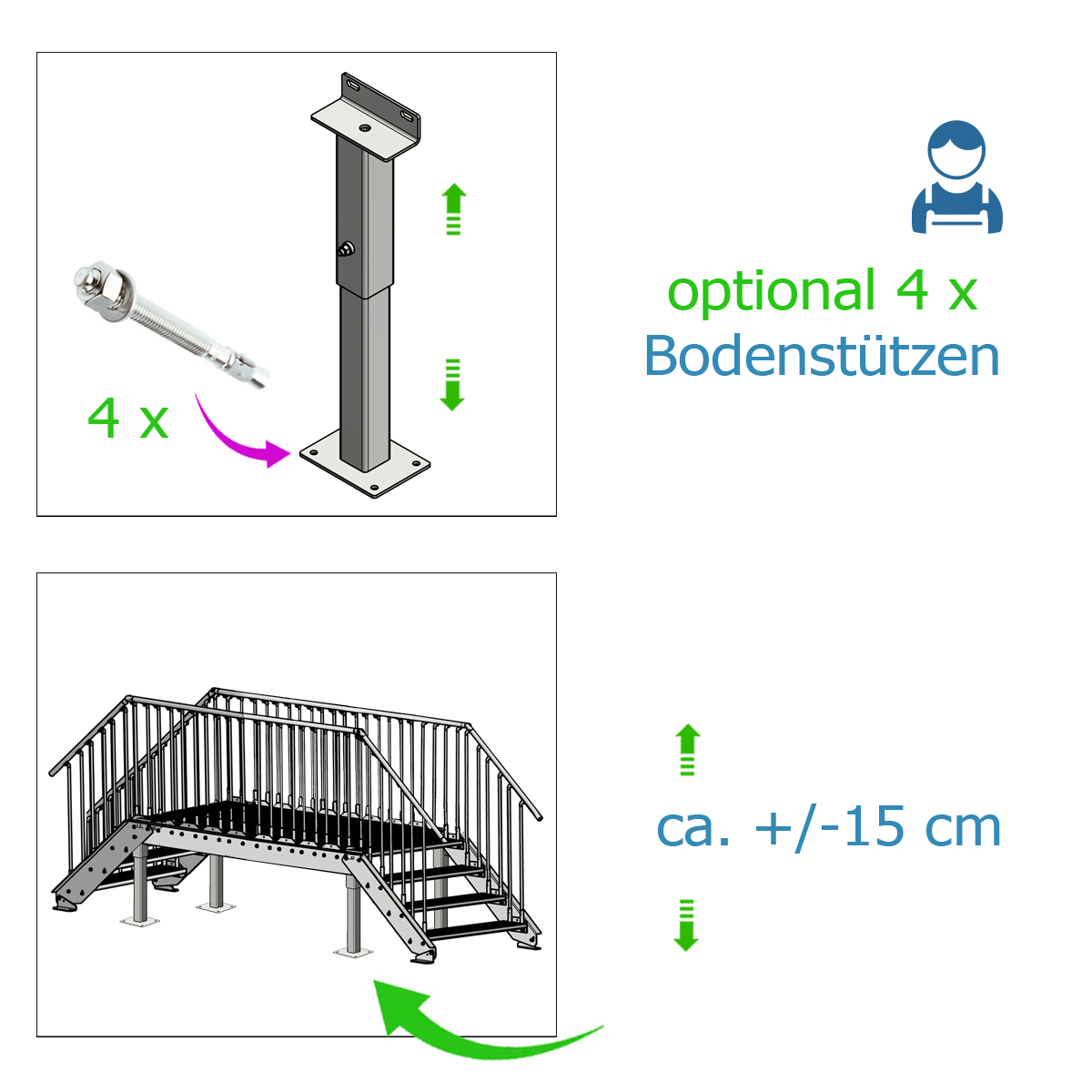 und einer abgehenden Stahltreppe in Höhen wählbar ab: 4 Stufen = Überbrückung von 60 cm (Durchgangshöhe)
