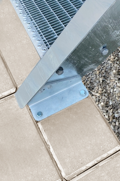Je nach Stellwinkel der Stahltreppe kann hier der Winkel hozizontal am Boden ausgerichtet und anschließend die Verschraubung fixiert werden.